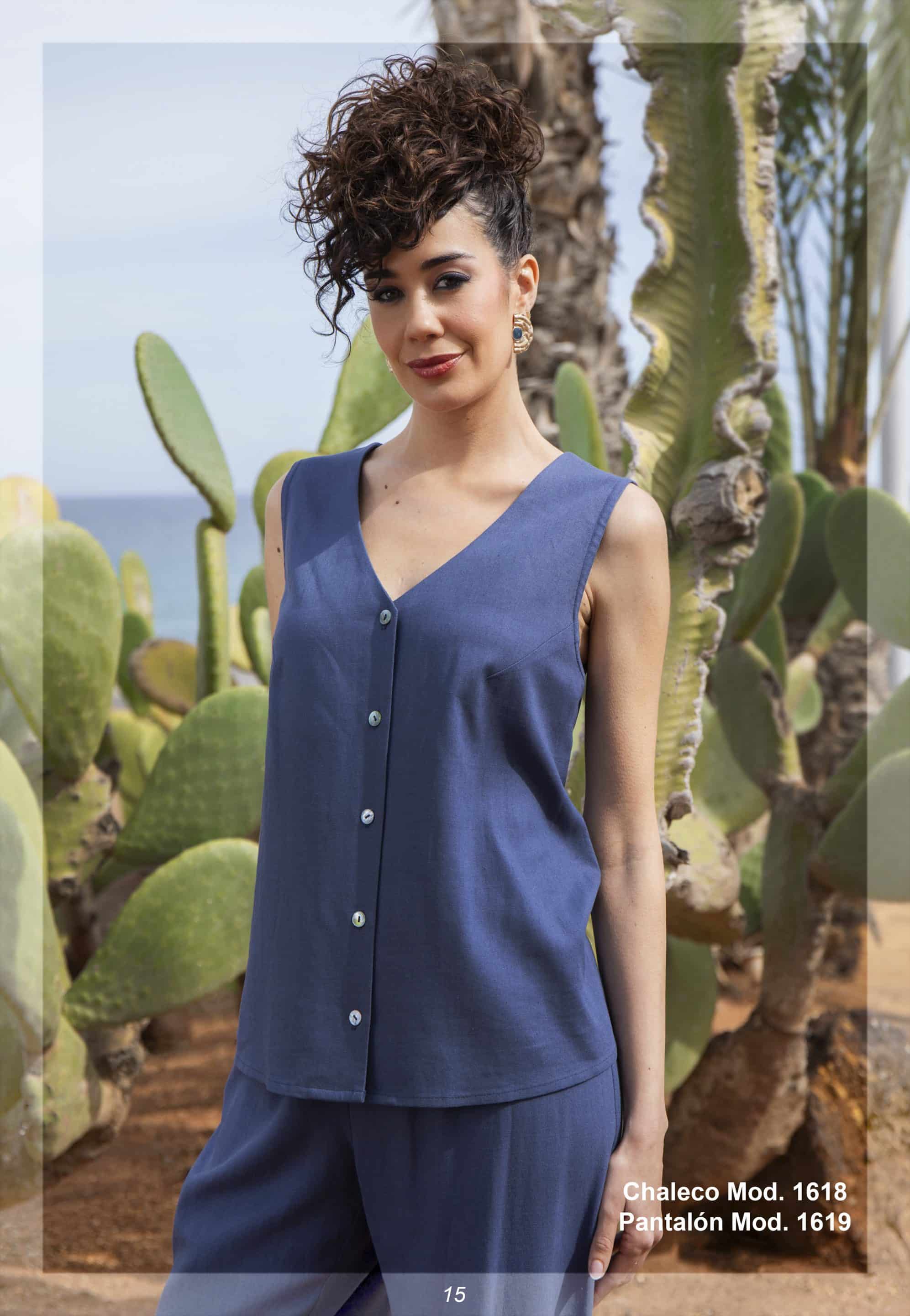 Chaleto confeccionado en una base de lino con botones nacarados en color natural.